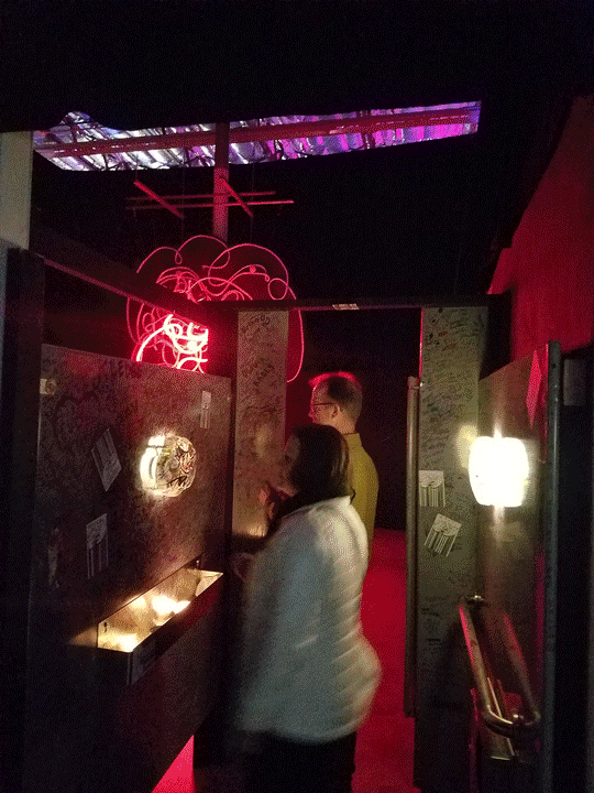 The Neon Scream was an interactive installation that I created in conjunction with John-Michael Reed aka Dr. Bleep which was part of the Hopscotch interactive experience. The idea of ANGRY CLOUD as a cathartic vehicle was explored in a physical way, as viewers would have the opportunity to scream all-out into a microphone, causing the cloud to animate, with greater reactions from more intense screams. The effect was that viewers realized after witnessing and experiencing the interaction that an all-out scream is both a rare and transformative action affecting both the screamer and onlooker. Visitors were then directed to exit through a repurposed bathroom stall, where they were encouraged to identify the source of the feeling that inspired the scream by writing it on the wall.